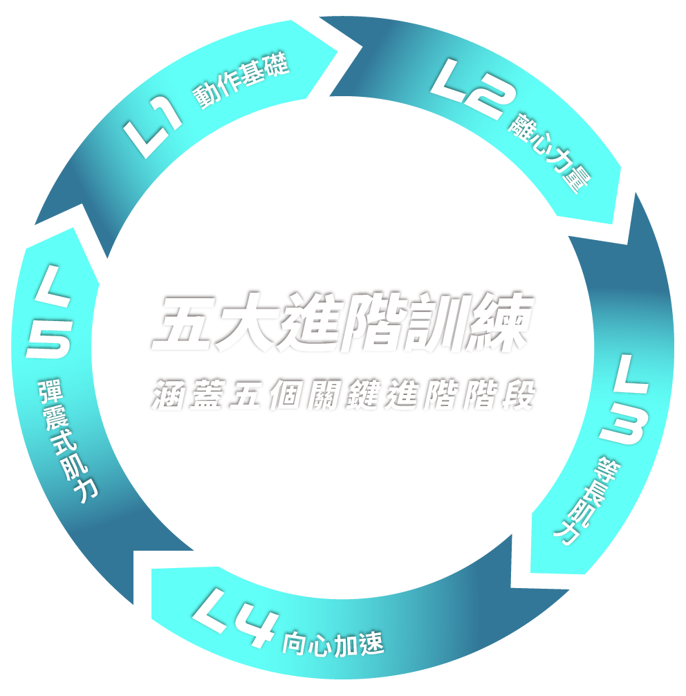 課程以 L1–L5 系統化鍛鍊,強化離心到彈震能力,讓身體從穩定進化至爆發